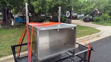 5' 5' x 11', 4 flat wiring, expanded metal decking, fold down iron gate, spare tire, 4 racket straps (Used for sheets of plywood and king mattress)